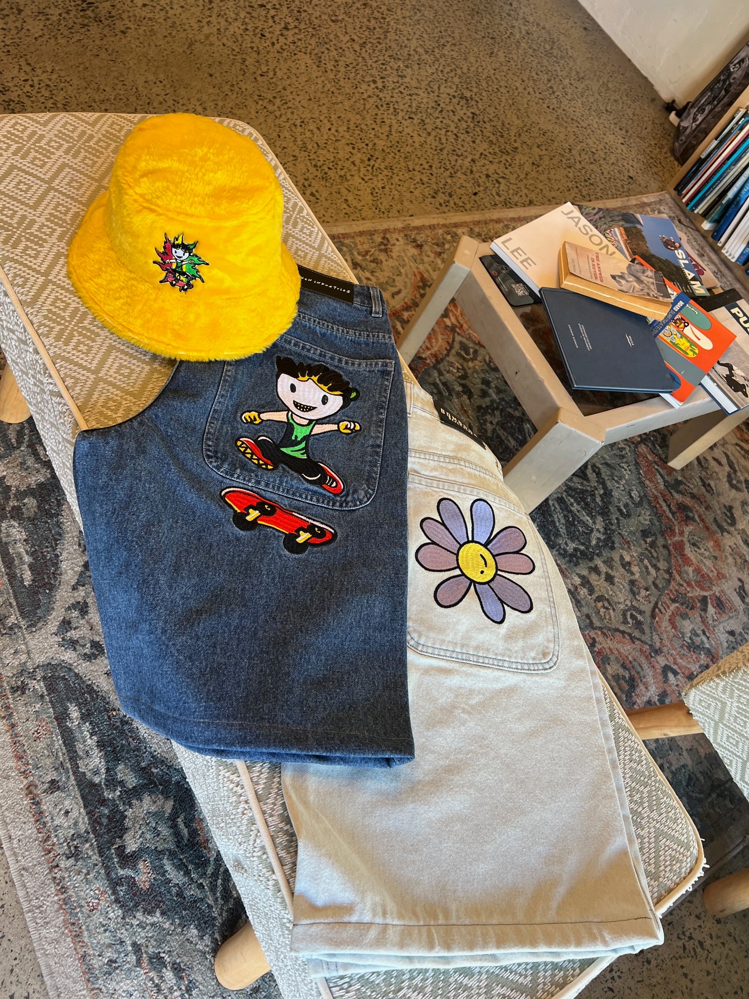 • Woven “Skater Kid” patch on coin and back pockets